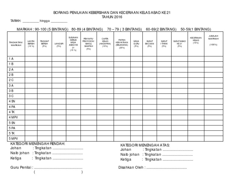 Borang penilaian kebersihan dan keceriaan kelas abad ke.