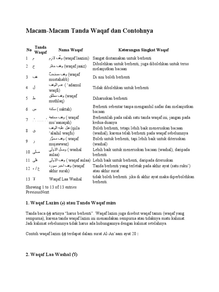 Jadi dalam membaca alquran kalau ada tanda baca waqaf berarti harus berhenti, baik itu berhenti sejenak atau berhenti keseluruhan dan melanjutkan kembali. Tanda mim ( مـ ) disebut juga dengan waqaf lazim. Tanda waqof dalam al quran. Tanda bujur `0' pada atas alif ا menandakan huruf tersebut hanya dibaca ketika waqaf(berhenti) padanya. Tanda baca alquran, arti,istilah dan aturan tanda baca alquran sangat penting untuk diketahui termasuk juga tanda baca yang menandakan apakah dibaca berhenti atau dibaca berlanjut, huruf sehingga dibuatlah tanda tanda baca ini. Ada juga yang memberikan pengertian qalqalah dalam ilmu tajwid bermakna memantulkan bunyi huruf tertentu baik karena sukun (mati asli). Di dalam alquran tanda baca fathah juga hadir dalam bentuk garis vertikal pendek (ا) yang disebut mad fathah atau alif khanjariyah. Wakaf lazim disebut juga wakaf taamm (sempurna) karena wakaf terjadi setelah kalimat sempurna dan tidak ada kaitan lagi dengan kalimat sesudahnya. Terdapat banyak hal di dalam al qur'an yang kalau di kupas tuntas tidak akan ada habisnya, namun kali ini kami akan membahas mengenai nama beberapa buah yang disebutkan dalam alquran, 7 buah tersebut adalah buah buah yang rasanya lezat itu, disebutkan dalam alquran sebanyak 14 kali. Sedangkan dalam pengertian istilahnya berarti menghentikan sejenak bacaan alquran dengan tanda la berarti jangan berhenti. Yakni lebih diutamakan untuk berhenti. Jadi apabila terdapat tanda waqaf tersebut, maka anda harus berhenti sejenak sehingga memutus bacaan tetapi tidak diperbolehkan bernafas. Artinya, pembaca haruslah berhenti seketika tanpa.