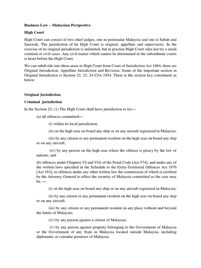 The federal court, the highest court in malaysia, reviews decisions referred from the high court of peninsular malaysia, the the federal court, of which the yang dipertuan agong is lord president, has original jurisdiction in disputes among states or between a state and the federal government. The sentencing jurisdiction under section 64 of subordinates court act 1948 provide that session court may pass any sentence allowed by the law except sentence of death. The jurisdiction of the malaysian courts is determined by the courts of judicature act 1964 for superior courts and the subordinate courts act the federal court of malaysia is the supreme court and highest judicial authority in the country as well as the final court of appeal in malaysia. These courts are presided by penghulus who have very limited jurisdiction within a 'mukim' or administrative district. The sessions court of malaysia has jurisdiction to try all offences other than offences punishable by.